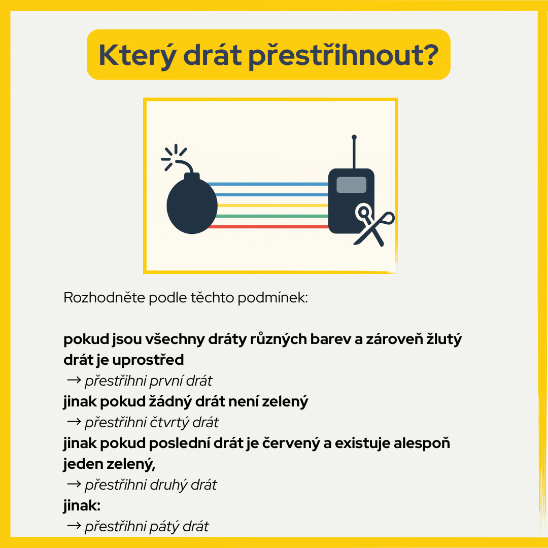 Například: zkontrolovat barvy → rozhodnout podle pořadí → vybrat správný drát.