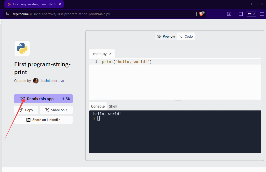 ⭐ https://replit.com/@LucieLenertova/introduction#main.py